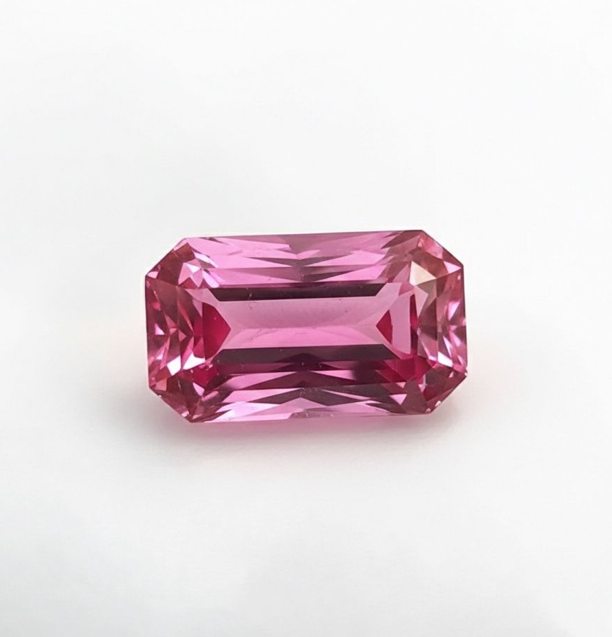 A stunning natural pink sapphire, cut in a classic emerald (rectangular step) cut, showcasing graceful lines and exceptional brilliance.
